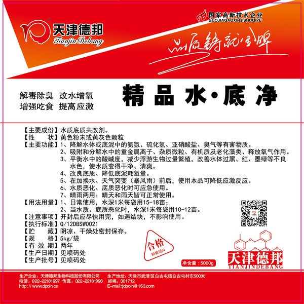 精品水底净 絮凝解毒型底改 改水改底【性 状】黄色粉末或黄灰色颗粒 【主要功能】1、改良底质、降低底泥耗氧量。2、水质恶化、底质恶化时可应急使用。3、晴雨两用:晴天和雨天皆可正常使用。【用法用量】1、日...
